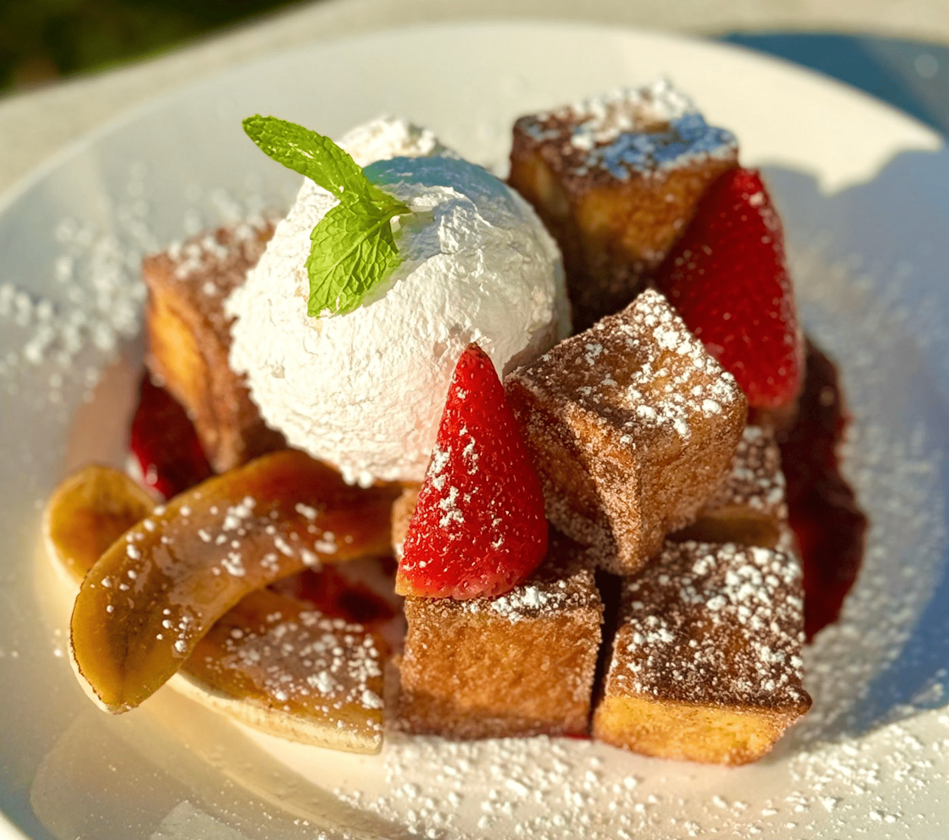 French toast bites, berry compote, cinnamon powder, strawberry, banana, and real cream