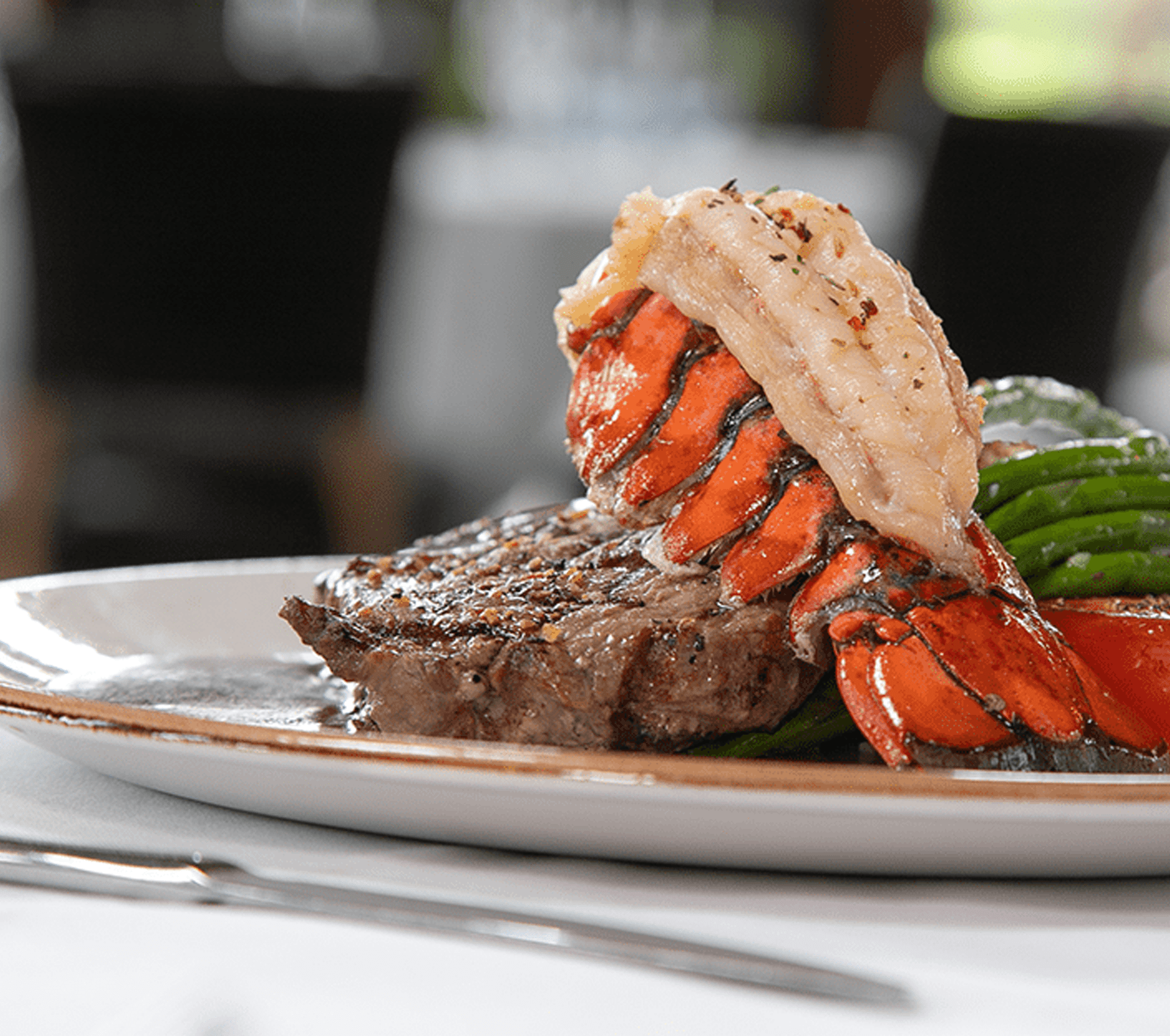 8oz AAA New York steak, 4 oz Atlantic lobster tail, market vegetables, roasted garlic Yukon gold mash, red wine jus - Steelhead & Lobster