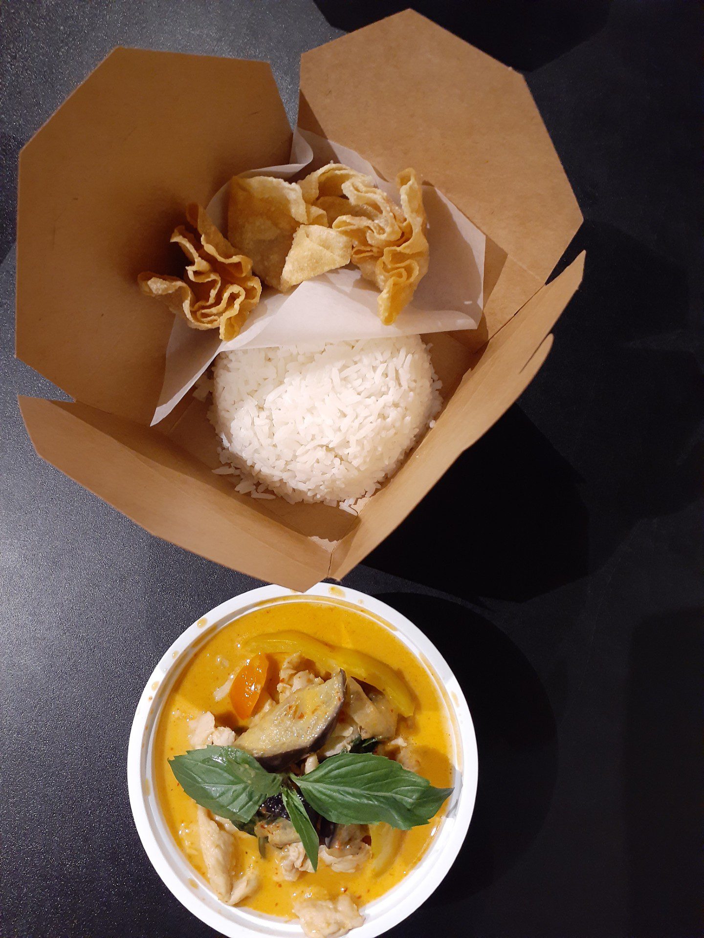 - Curry and Rice (choice of 5 curry sauces: Green, Red, Panang, Mussamun, Yellow) with Chicken or Pork or Tofu for Vegetarian option