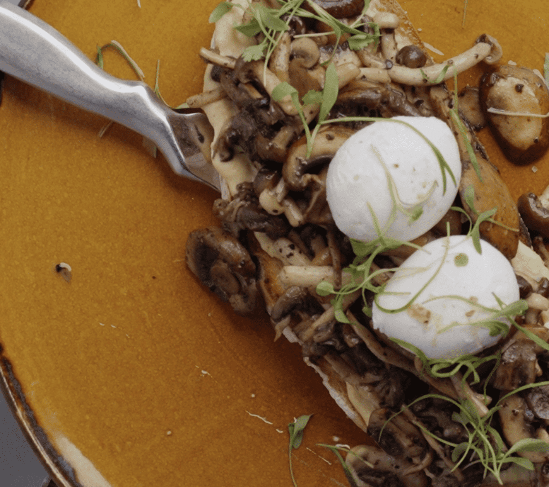 Crostini with hummus, wild and cultivated mushrooms, truffles, garlic confit, poached hen eggs and lavender fleur de sel - Rabbit Benny